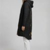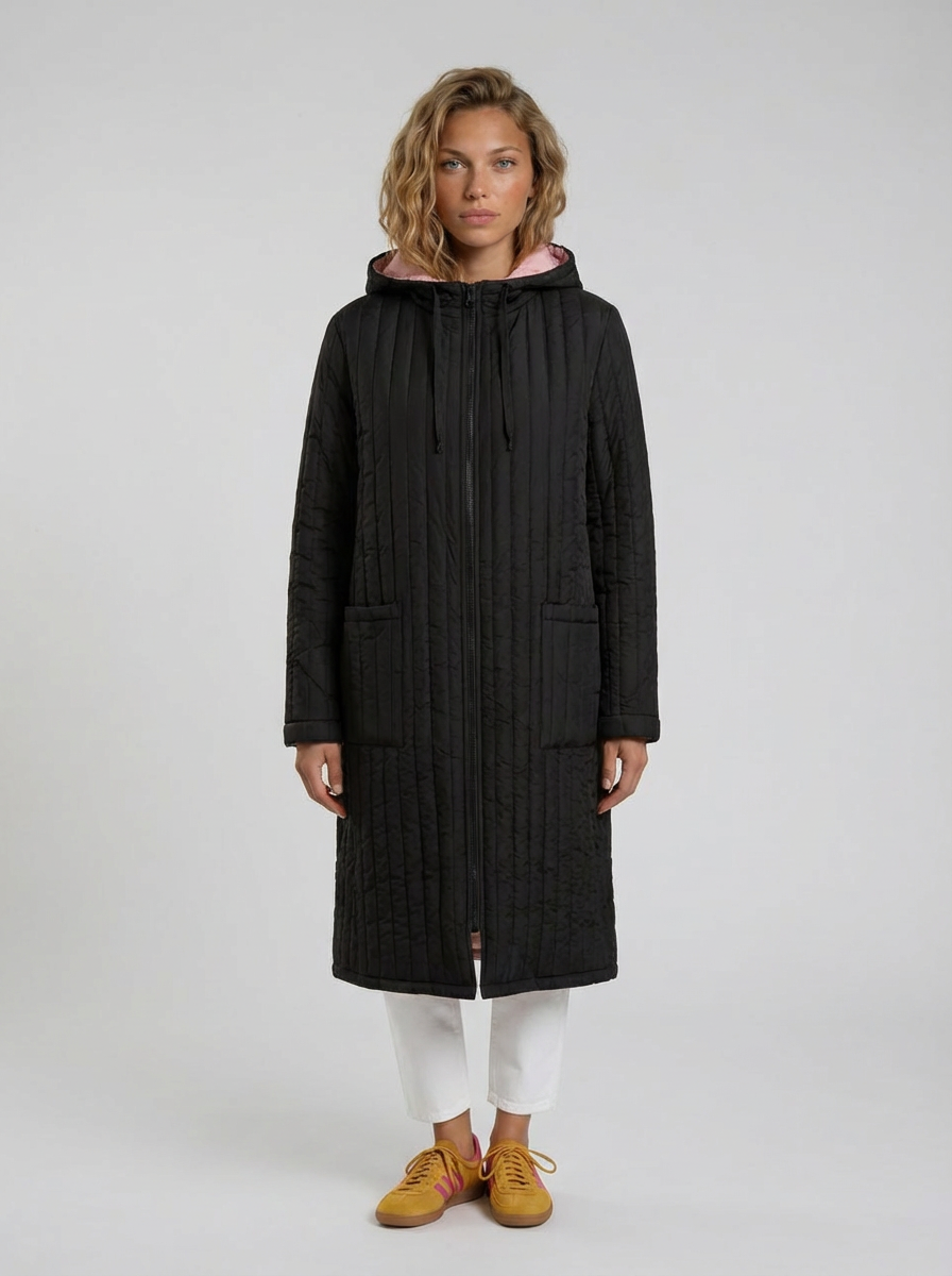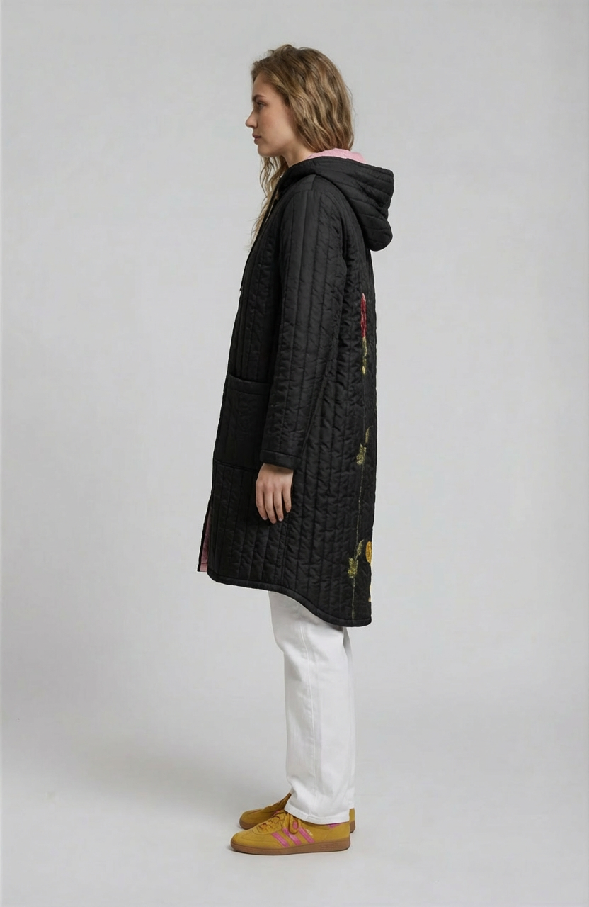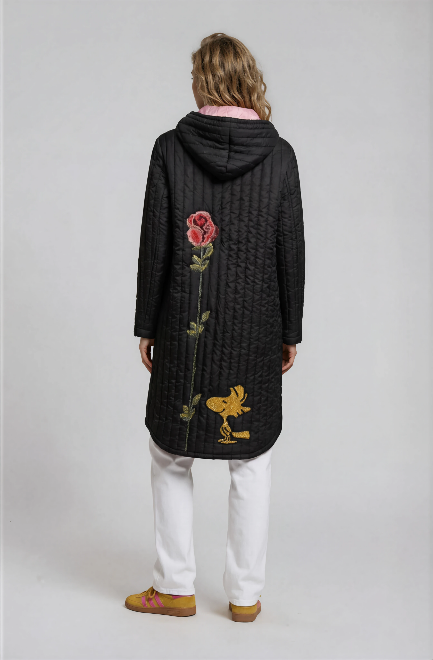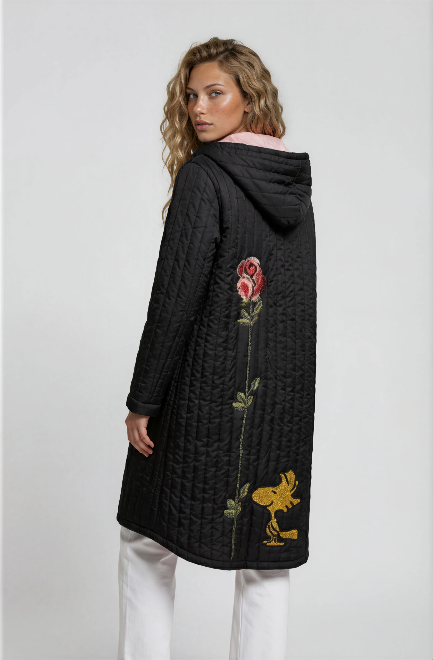 Quilted puffer coat with a pink inner lining, zip closure, and a detachable hood. Features back embroidery with Swarovski crystal details.