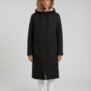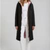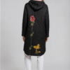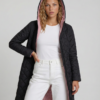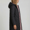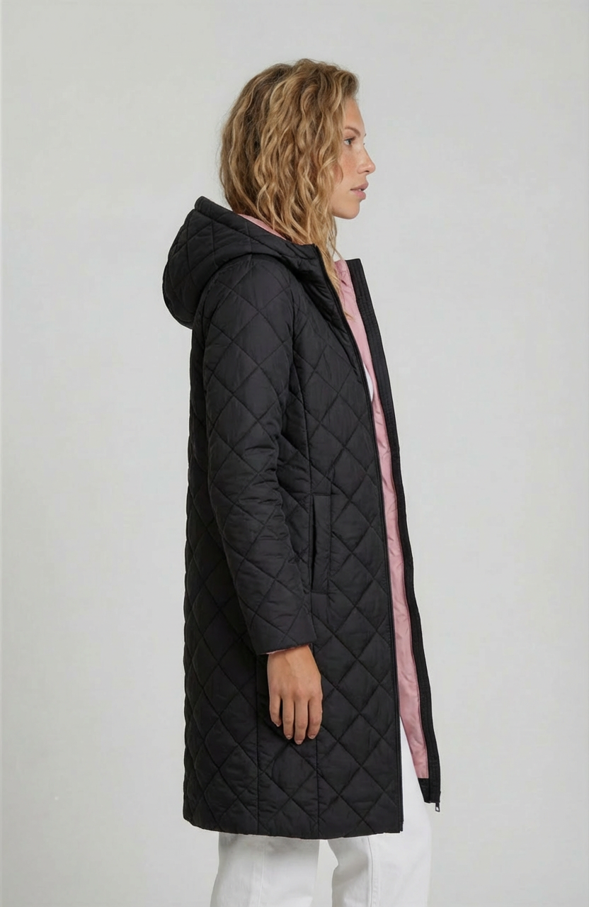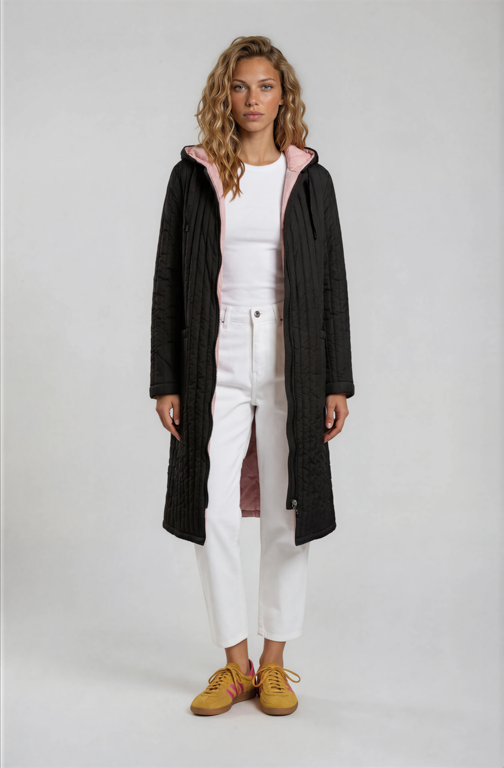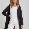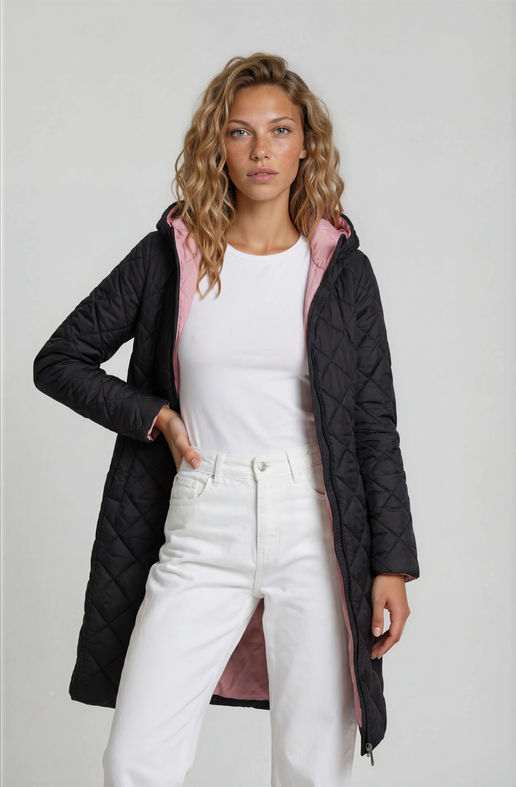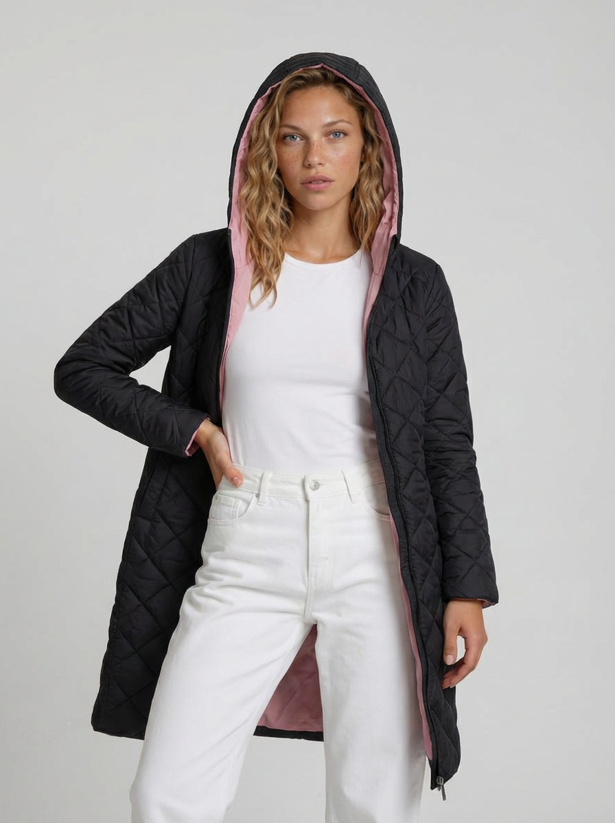 Quilted puffer coat with a pink inner lining, zip closure, and a detachable hood. Features back embroidery with Swarovski crystal details.