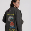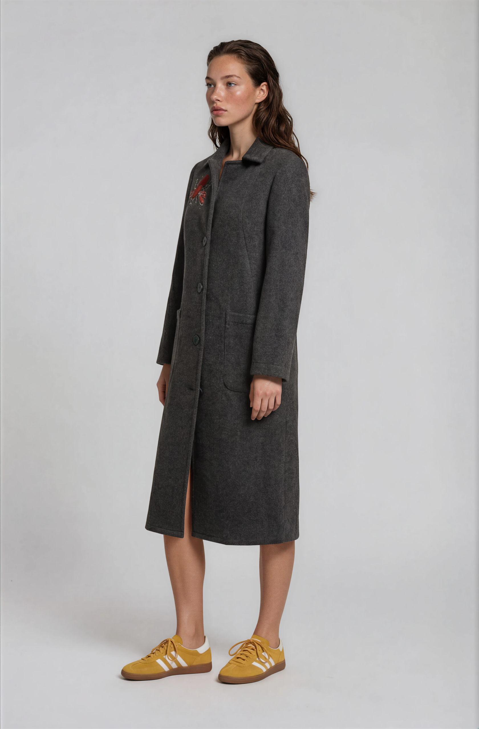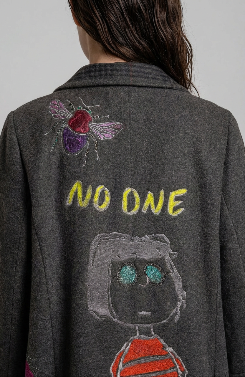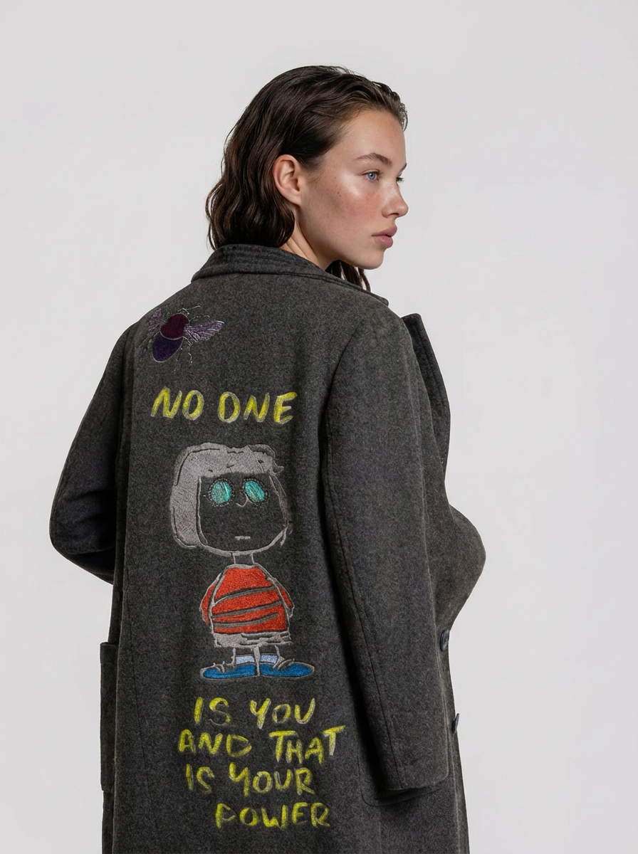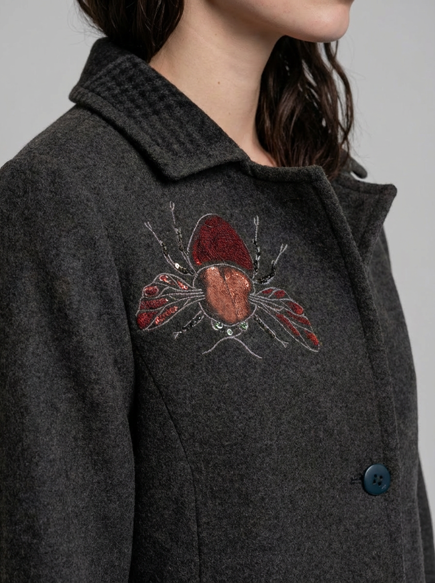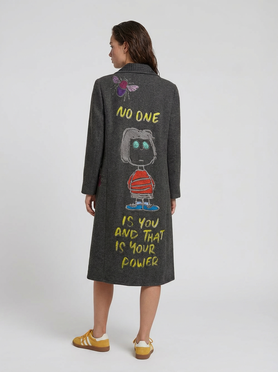 Long wool coat with two front side pockets and a button-front closure. Features back embroidery combined with hand-painted details. size M/L