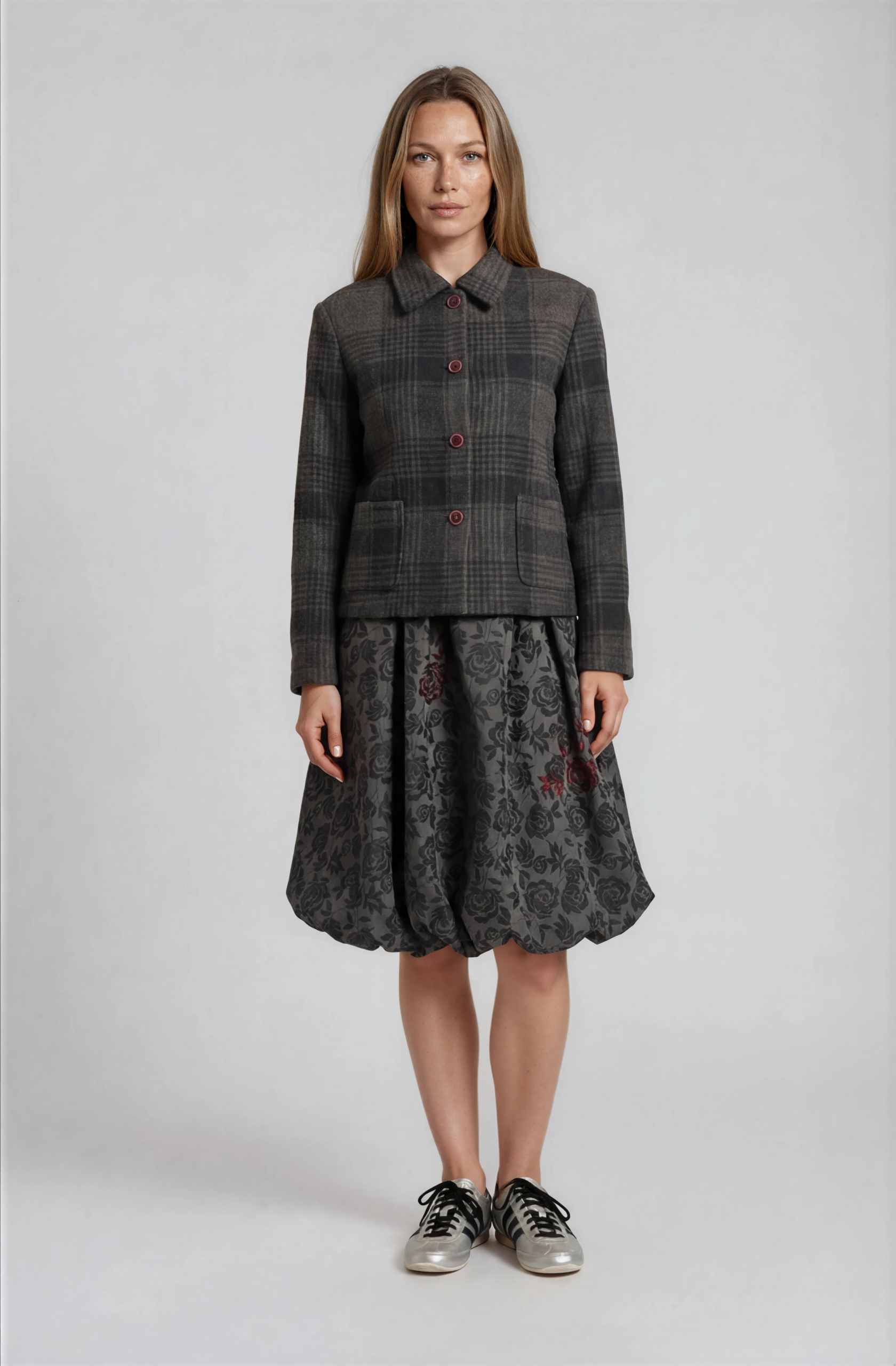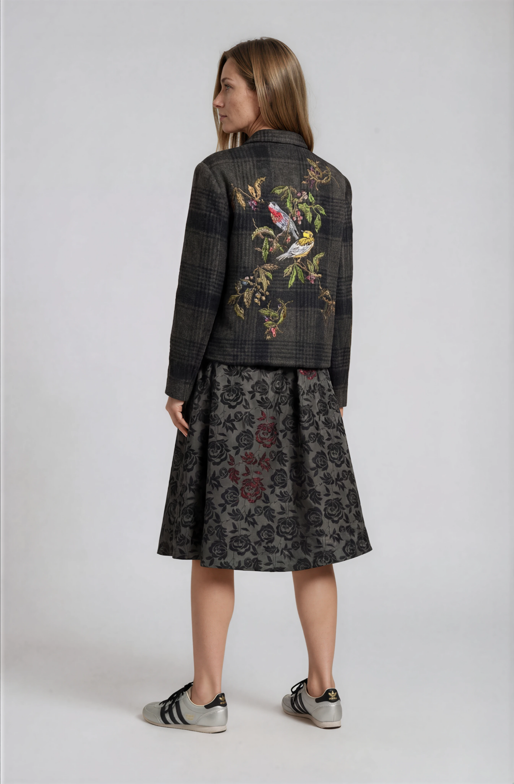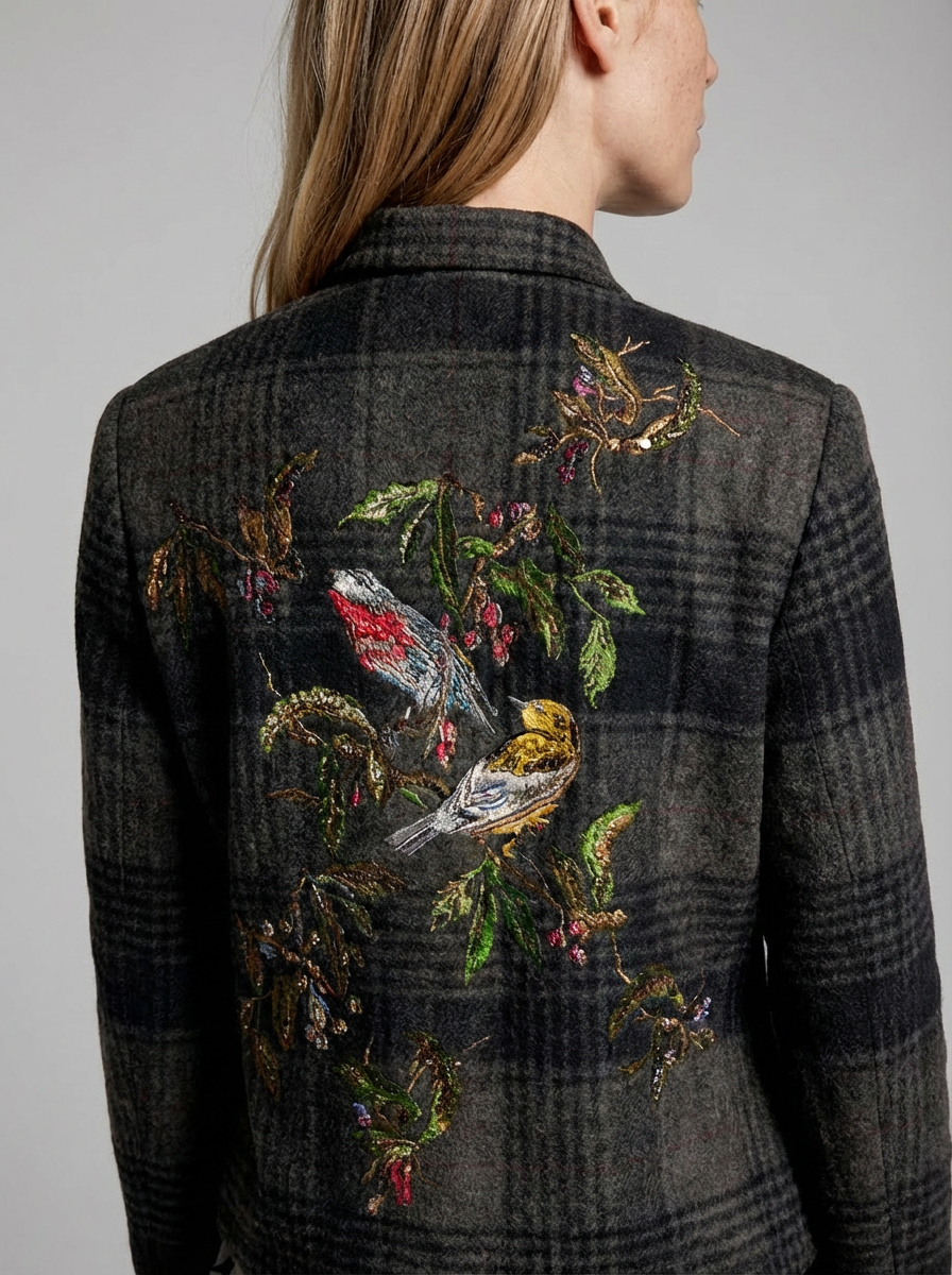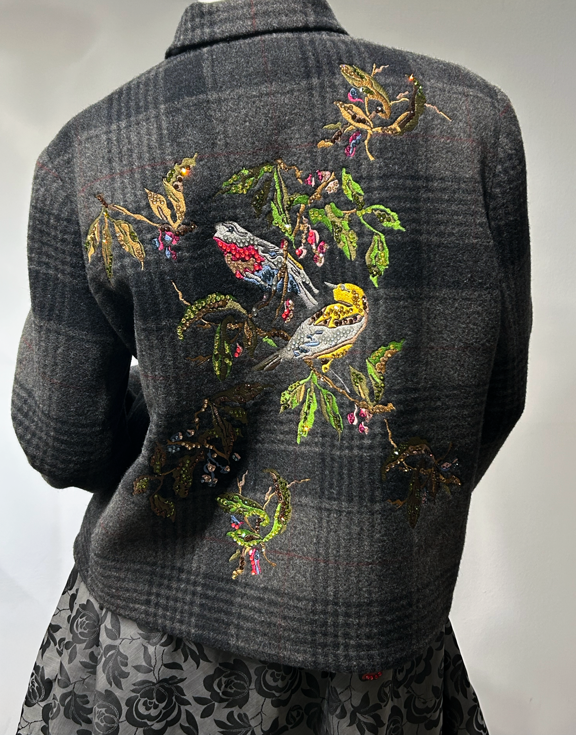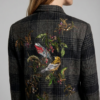 Plaid wool coat with a statement embroidered back and Swarovski crystal details, finished with a front button closure.