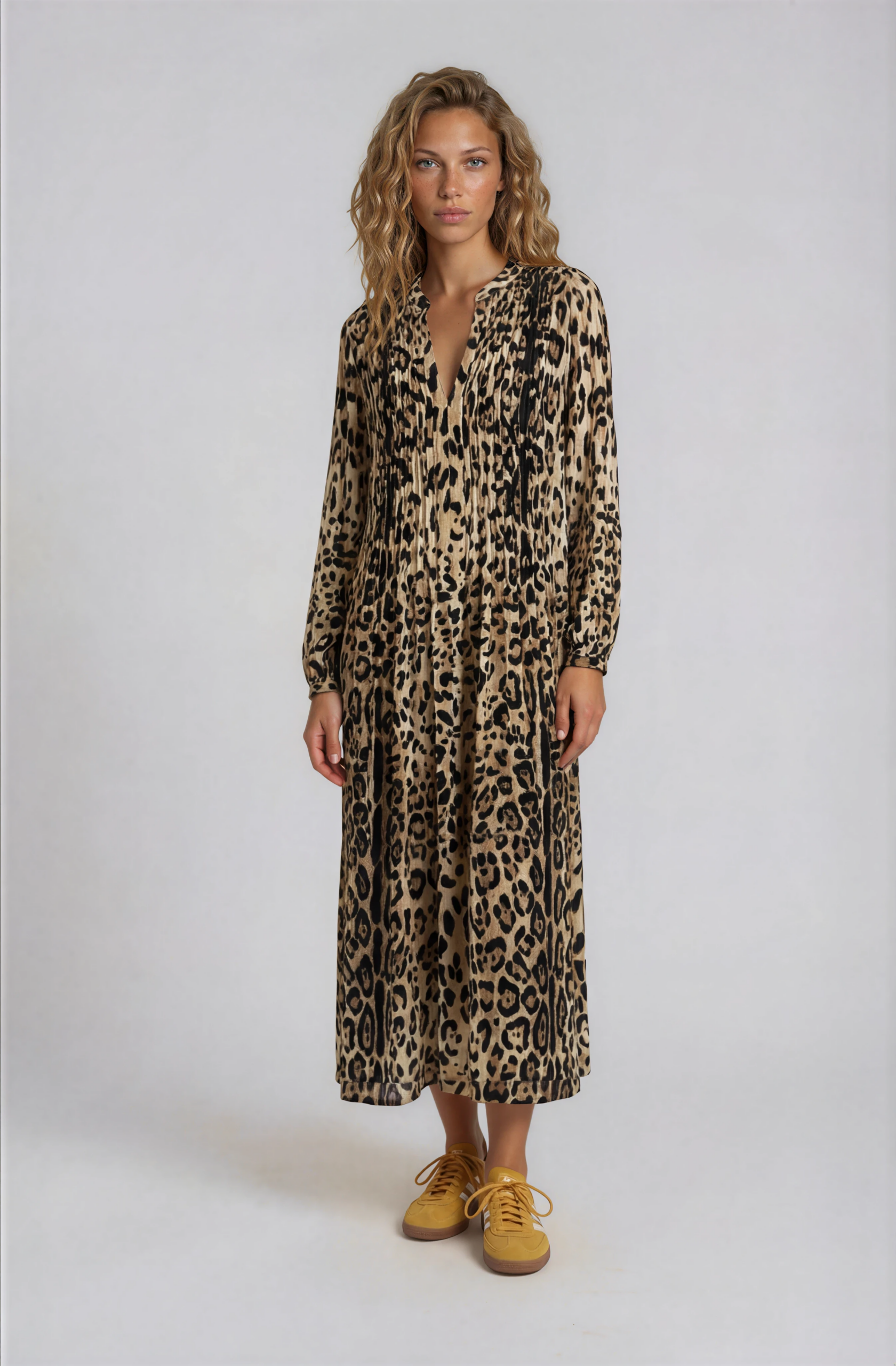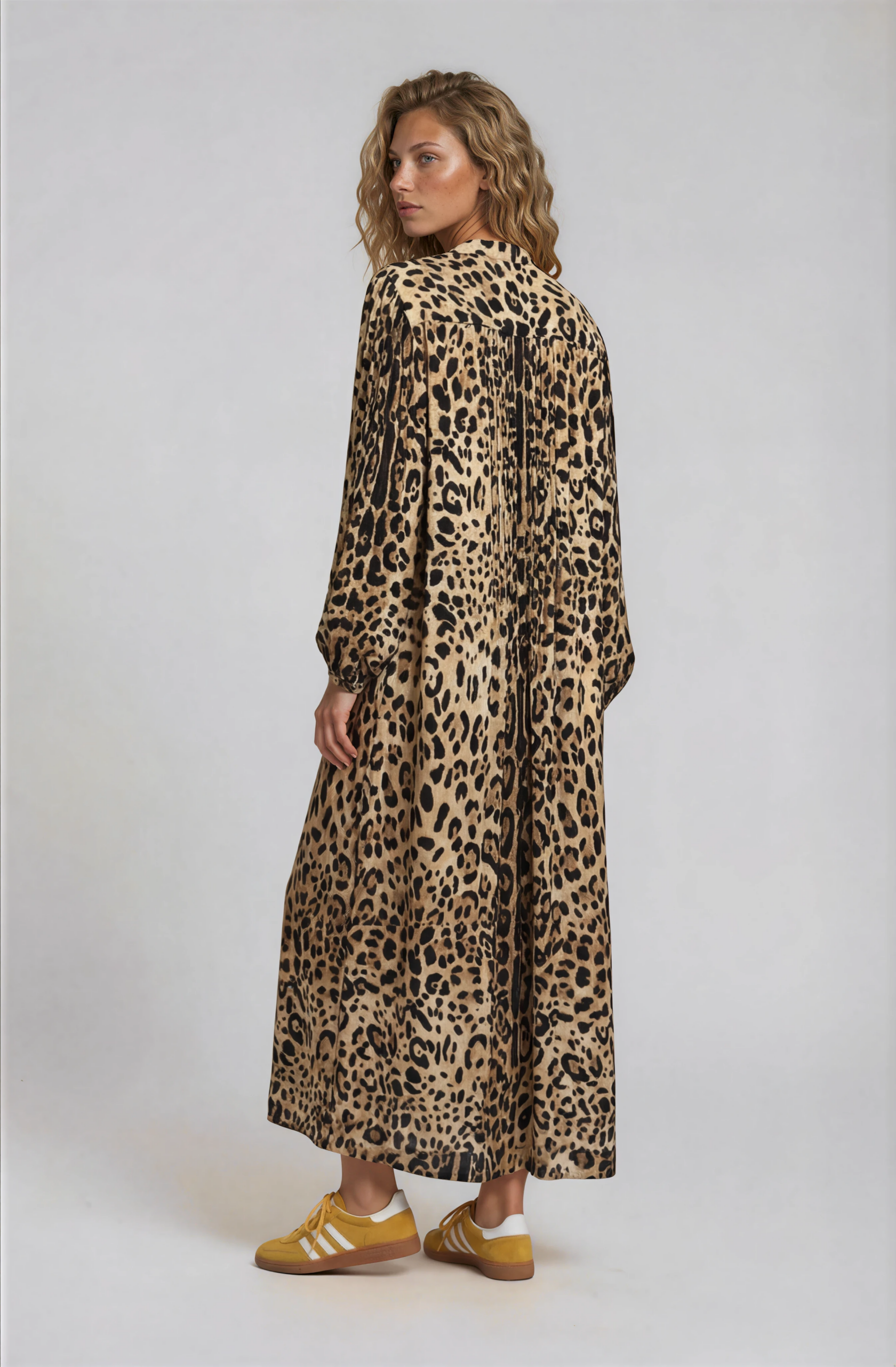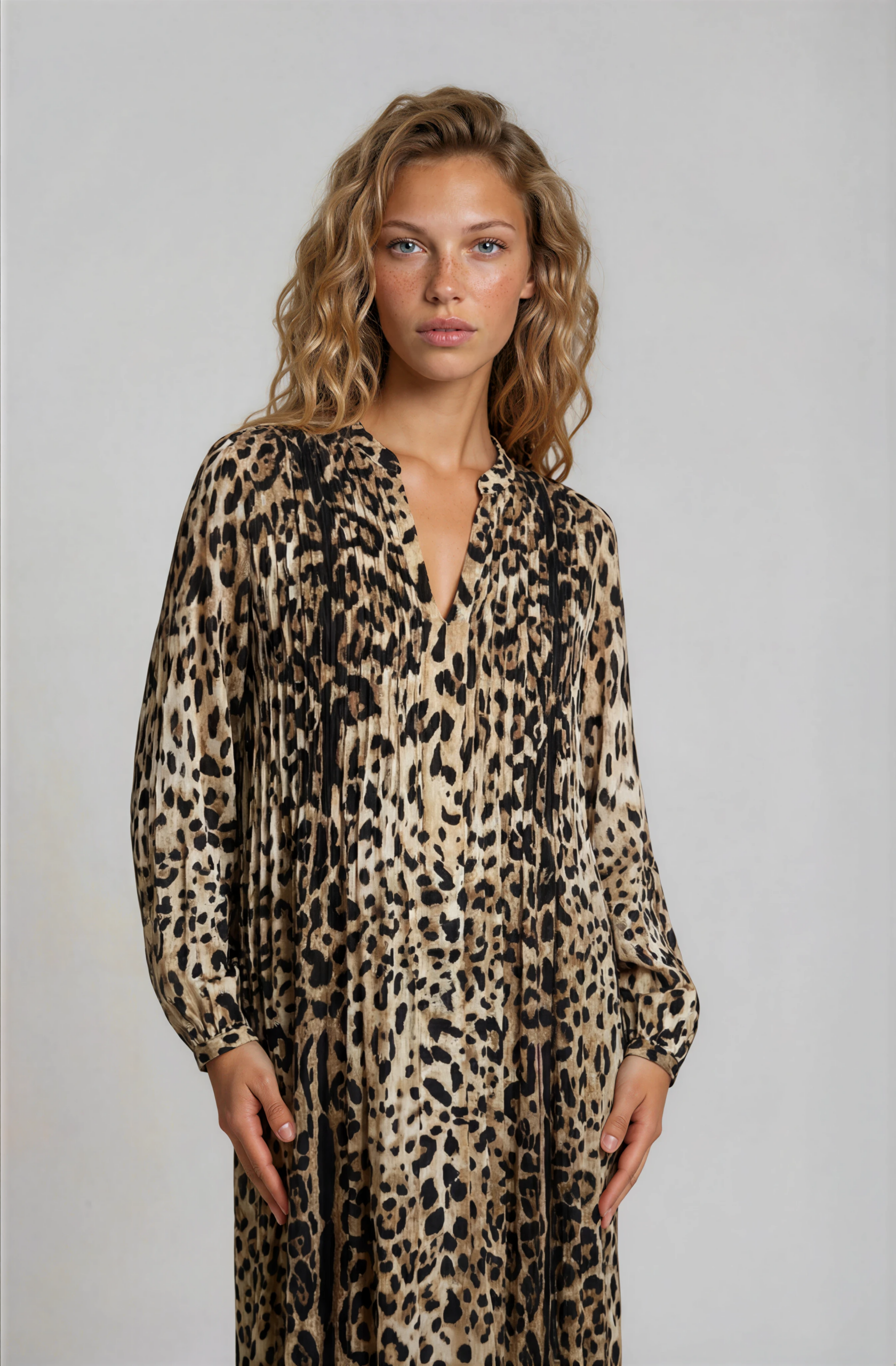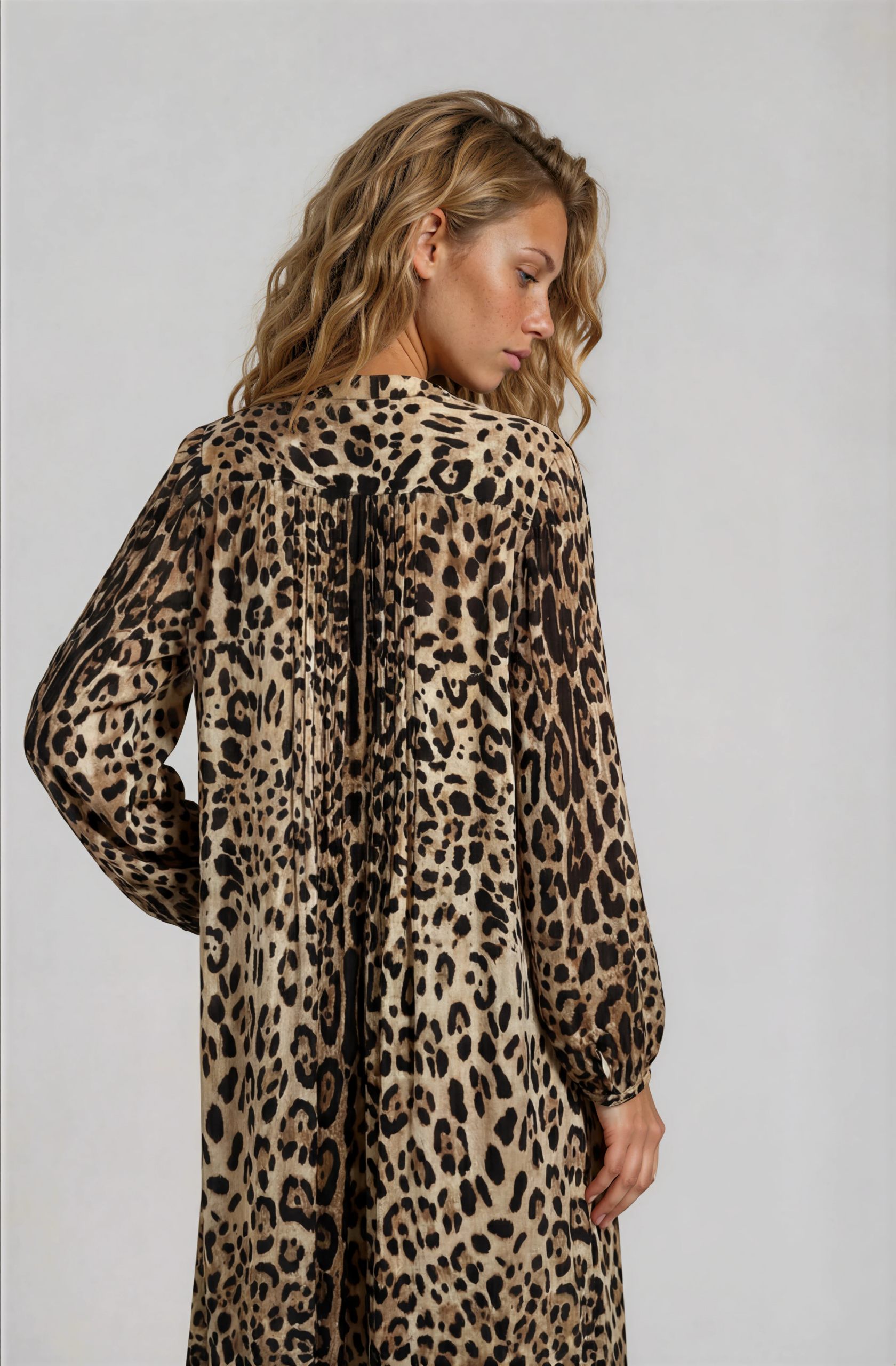 A silk dress in a leopard print, designed in our signature silhouette with delicate folds at the chest and back.