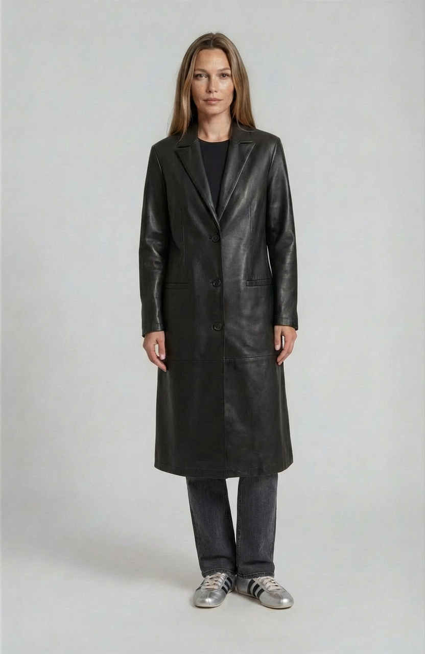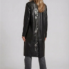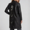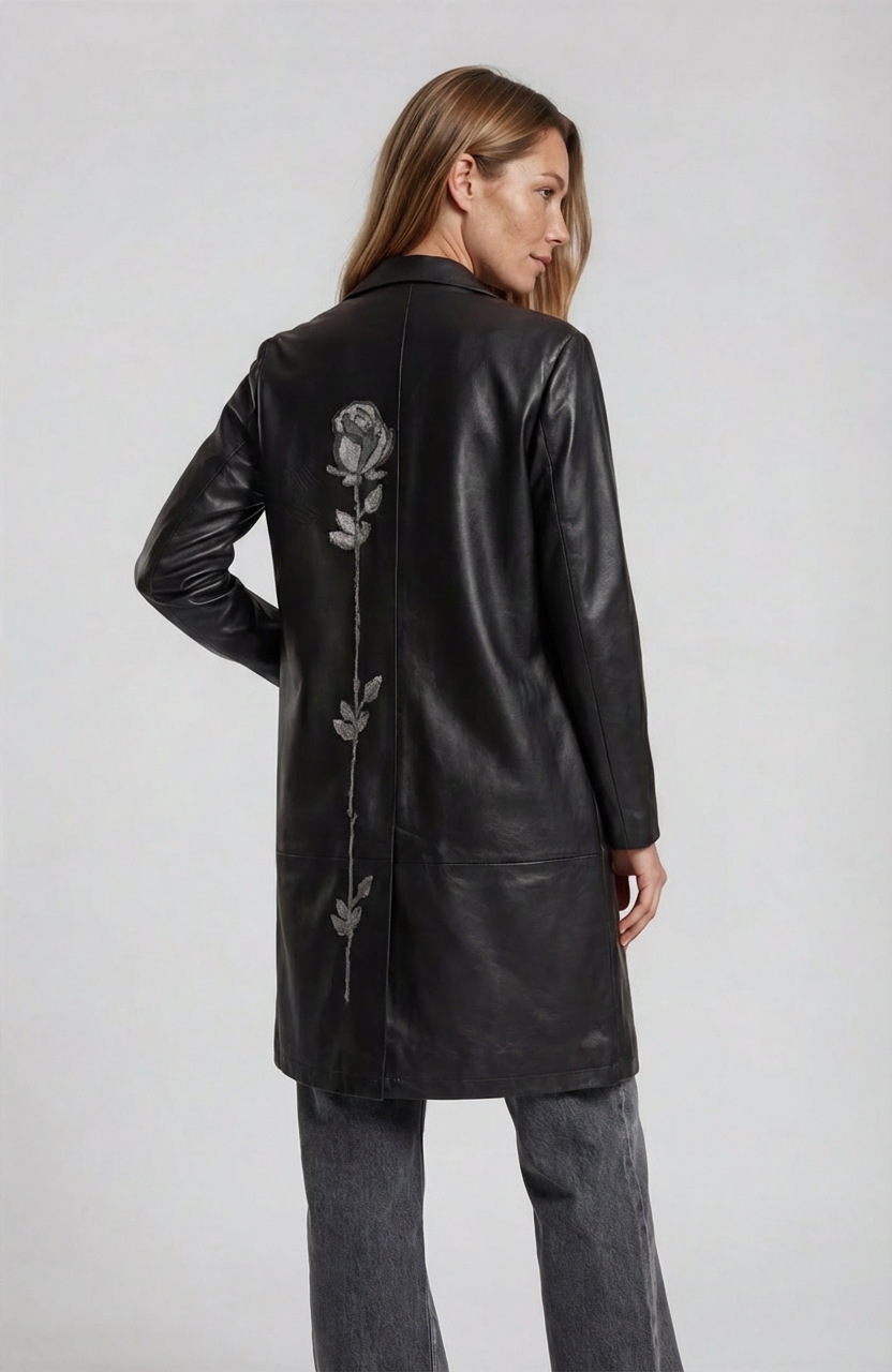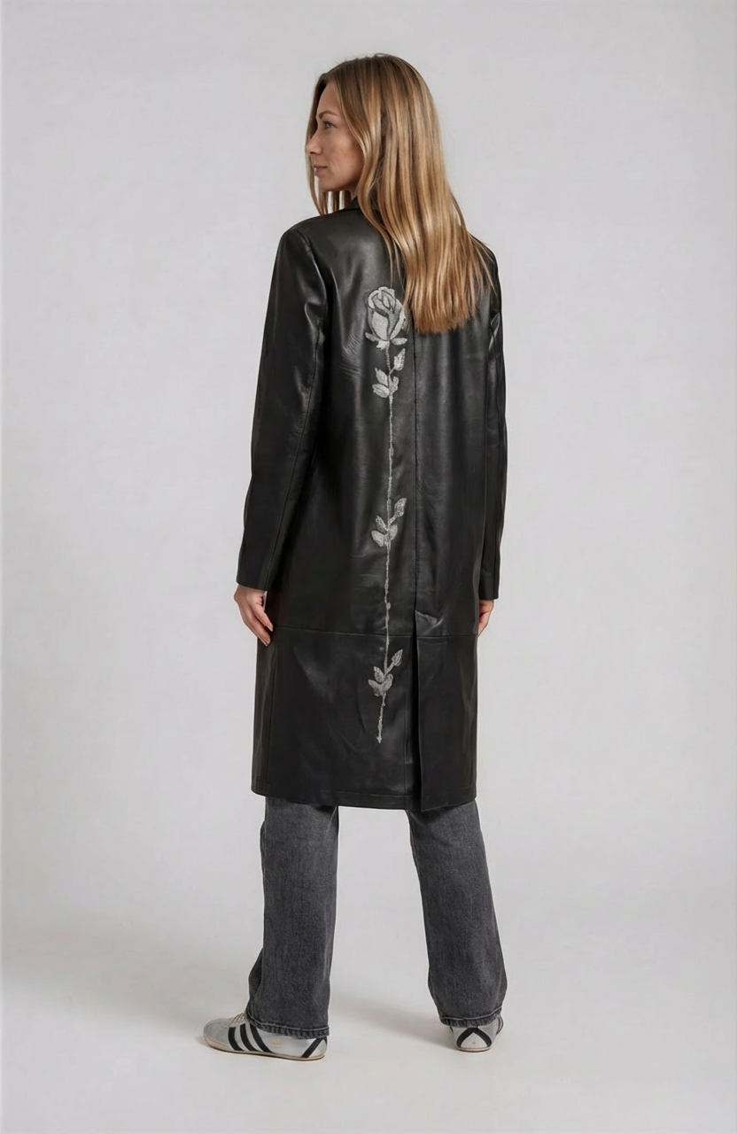 Long leather coat with a floral embroidery, front pockets and a back slit.