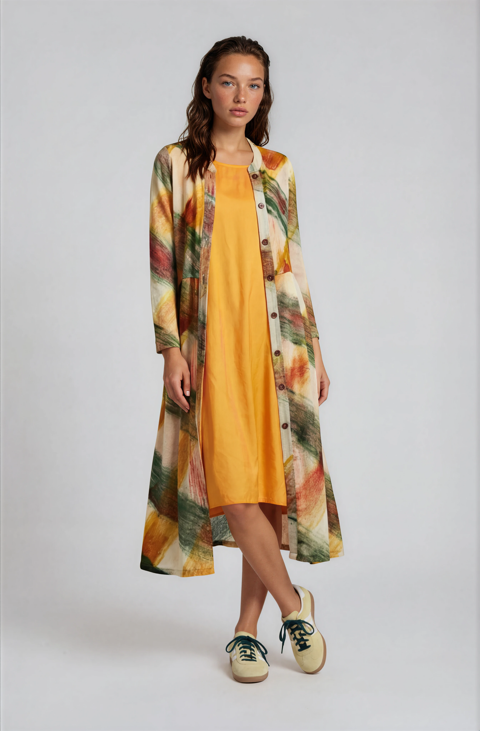 A lightweight jacket crafted from a soft, breathable fabric featuring a painterly brushstroke print.