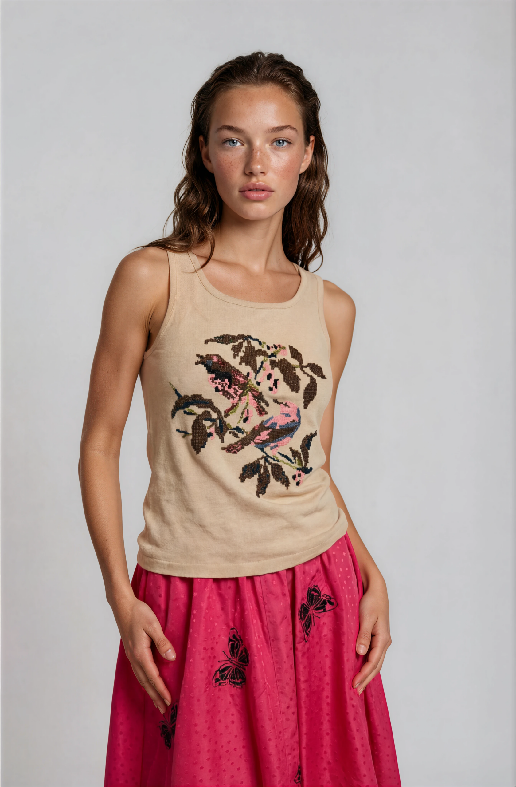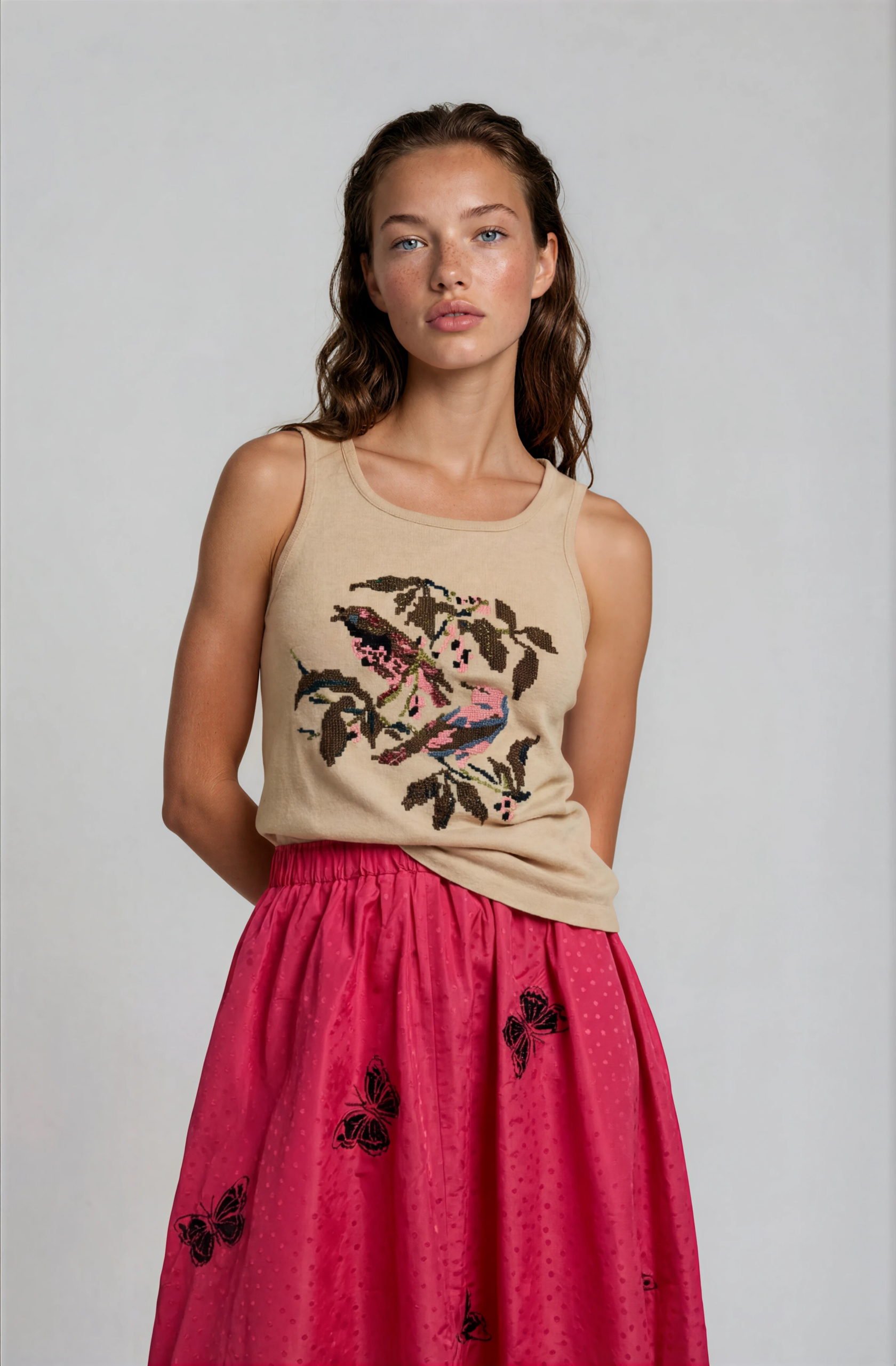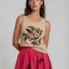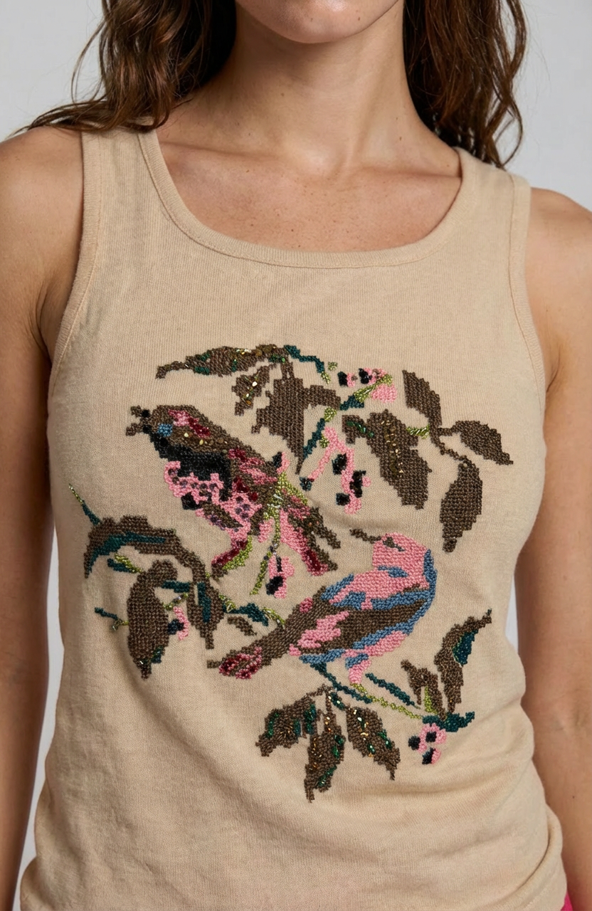 Knit tank top with front embroidery and Swarovski crystals details. size S