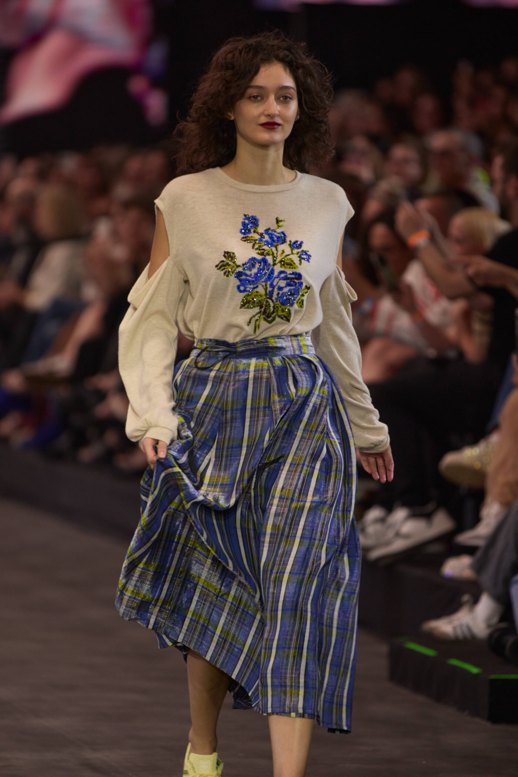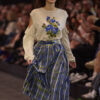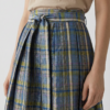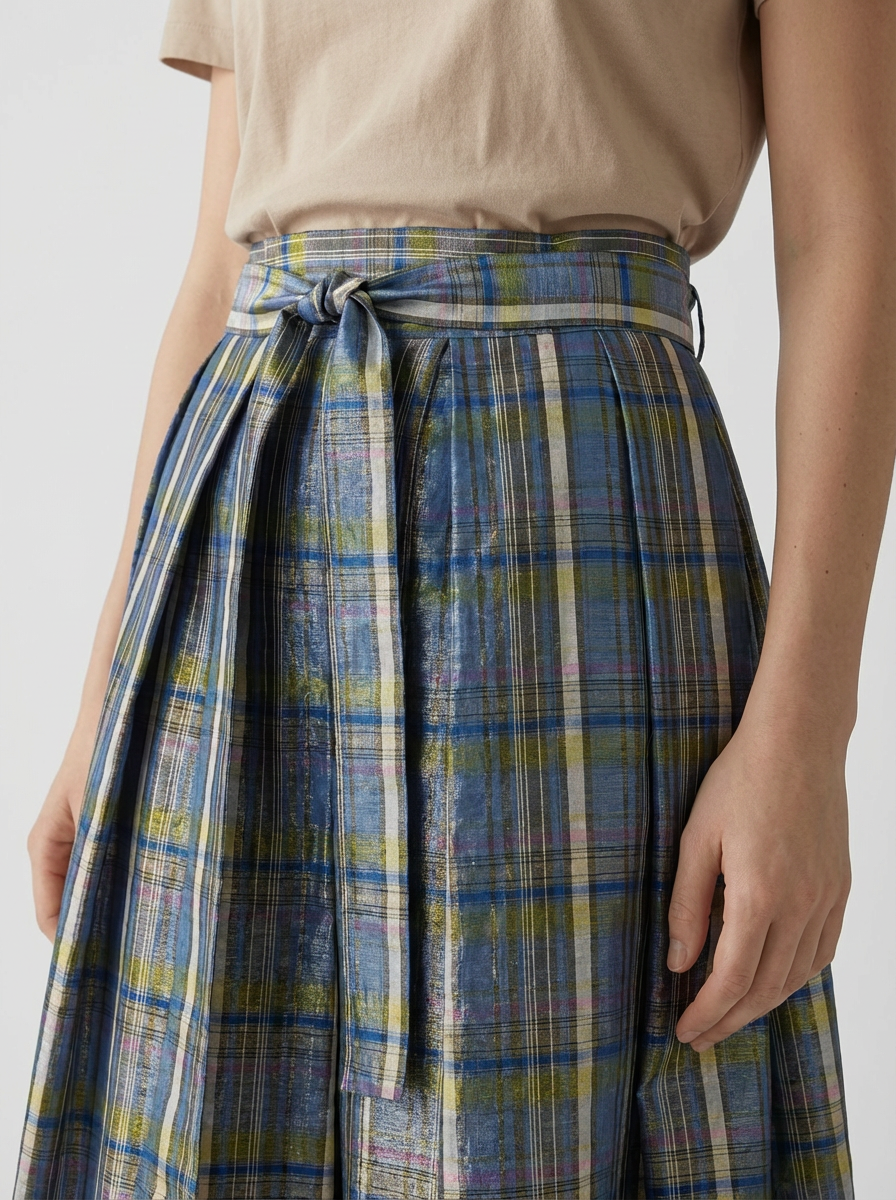 A wrap-style skirt with a soft tie closure at the waist, a subtly shimmering fabric that catches the light with movement.